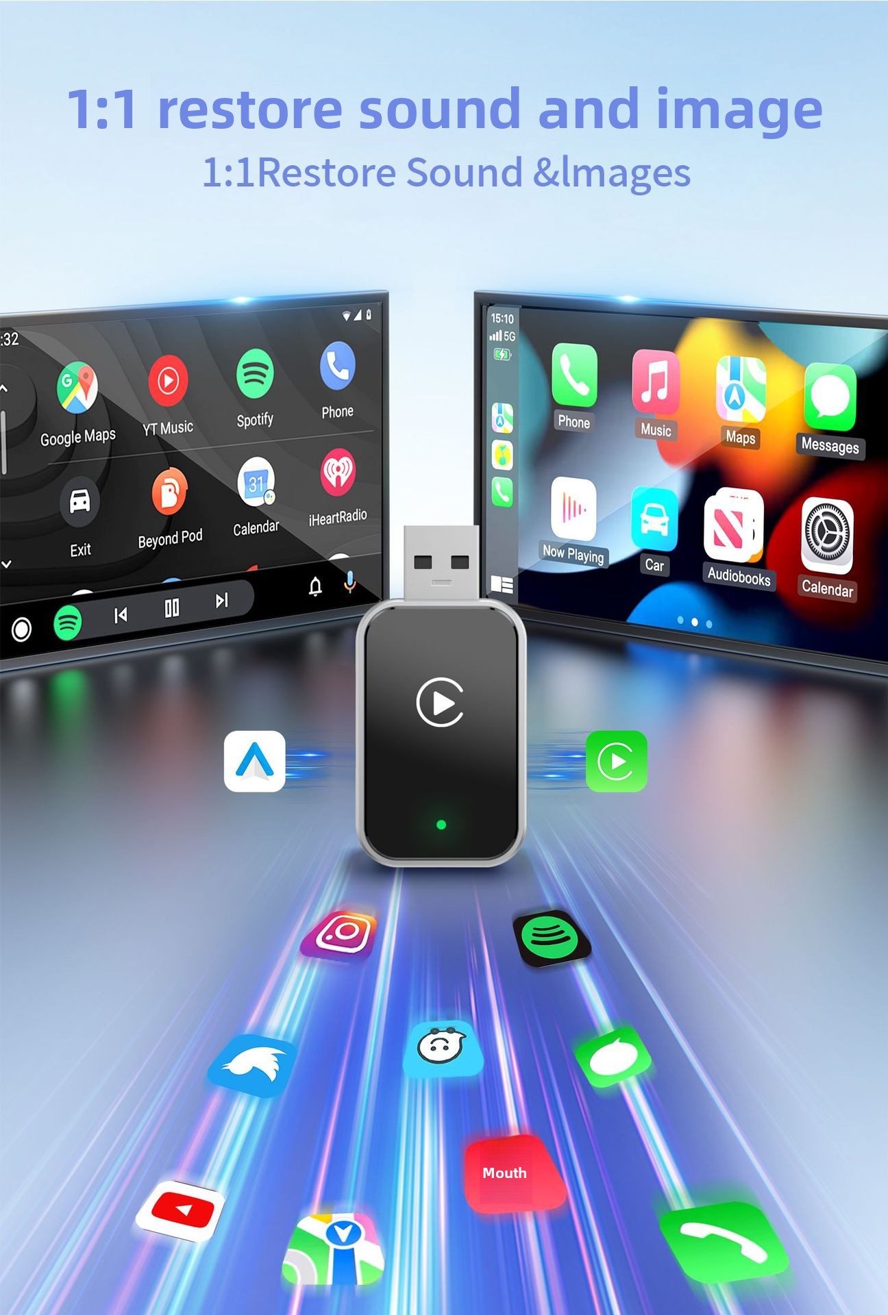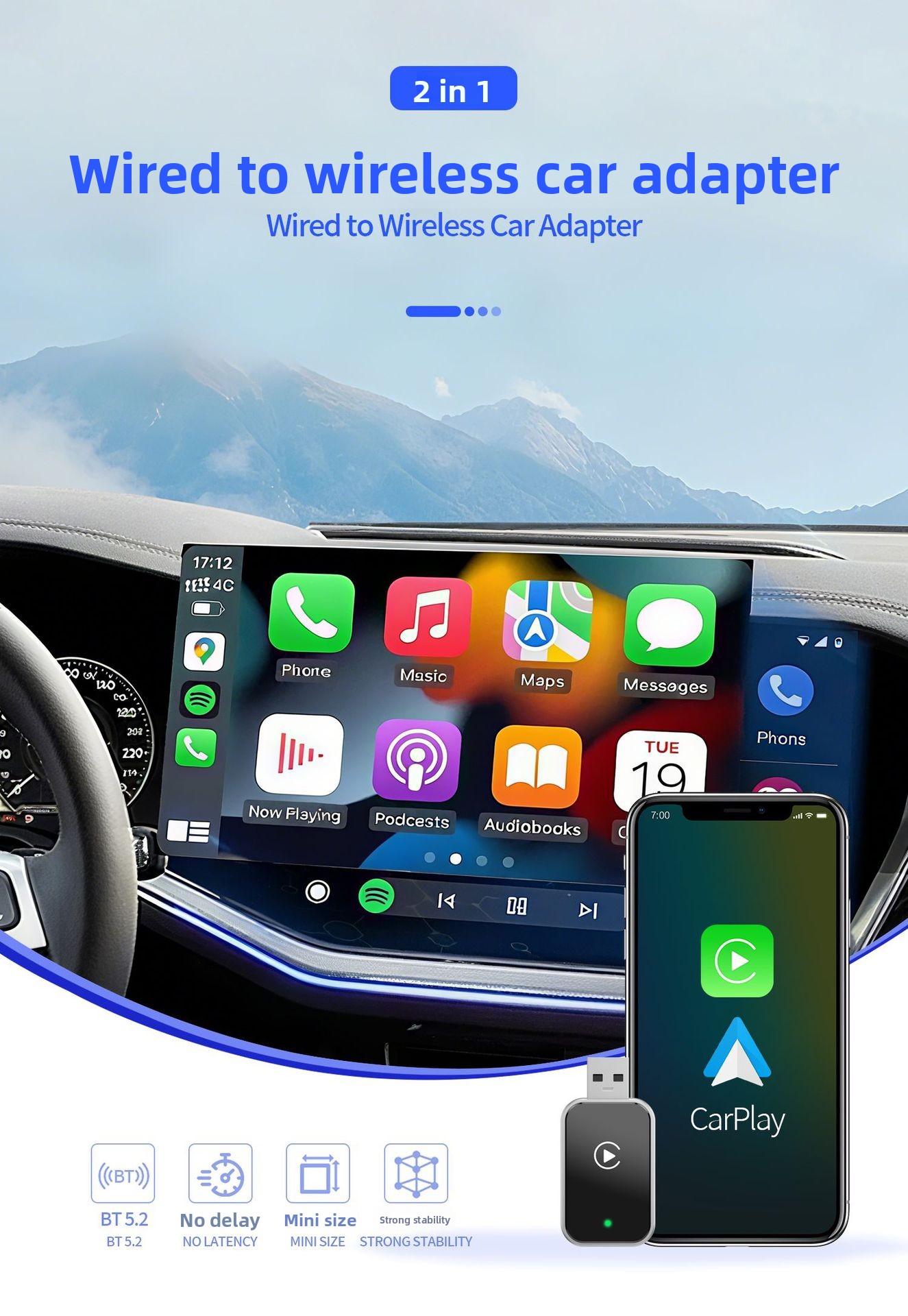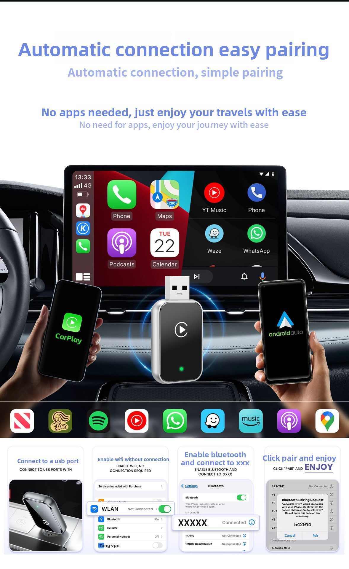 Wireless Connectivity: Converts wired CarPlay and Android Auto to wireless, offering seamless smartphone